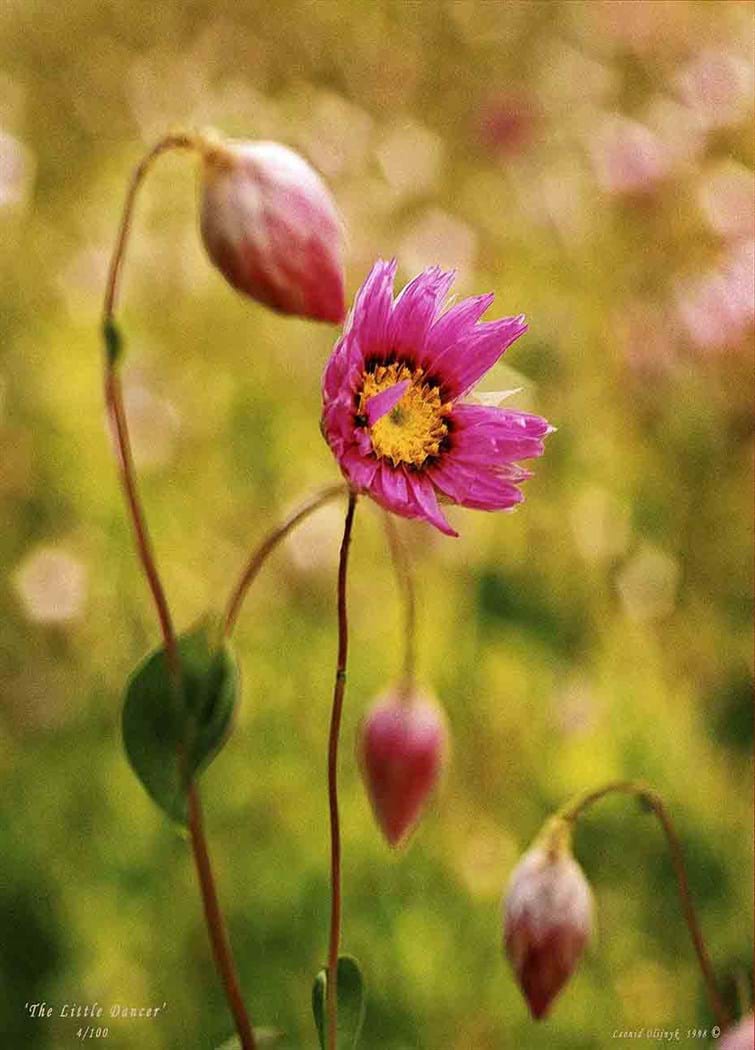 Leonid prefers to photograph wild flowers on an overcast day, with the least amount of wind or air disturbance. He recommends using a white reflector or white umbrella held over single flowers on a sunny day. The effect of this shade on the subject will amaze you! Try it and see!